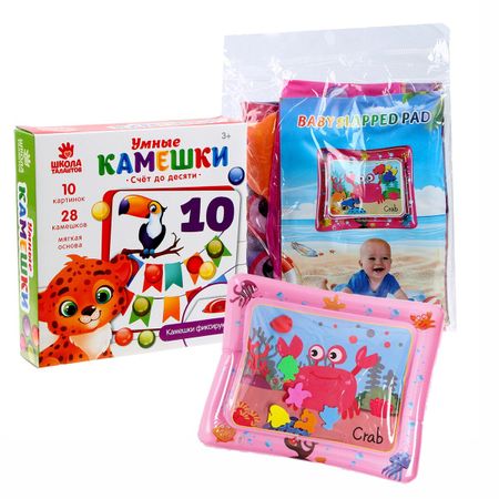 Развивающий набор: «Умные камешки» и акваковрик. Развивающий набор — идеальный способ познания окружающего мира для малышей. <b> Что в наборе:</b> <ul> <li> игра «Умные камешки» (мягкая основа, 28 камешков,10 картинок),</li> <li> акваковрик «Крабик».</li> </ul> Акваковрик «Крабик» — это надувной детский водный коврик для стимуляции развития ребенка. Внутри коврика находится вода. <b> Польза от игр с ковриком</b> <ul> <li> Улучшает моторные навыки.</li> <li> Тренирует зрительно-моторную координацию.</li> <li> Развивает сенсорное восприятие.</li> <li> Проводит профилактику плоского затылка у малышей.</li> <li> Укрепляет мышцы шеи, рук и ног.</li> </ul> <b> Как играть в игру «Камешки»</b> <ol> <li> Положите мягкую основу, с помощью липучек прикрепите к ней карточку. Выполните задание, используя камешки. Они провалятся в отверстие и зафиксируются на основе.</li> <li> Задания направлены на изучение цвета, форм, величин. Развивают логическое мышление и мелкую моторику.</li> <li> Камешки можно использовать как счетный материал.</li> <li> Обратите внимание: набор содержит мелкие детали. Использовать только под присмотром взрослых.</li> </ol> Рекомендовано для детей от 3 лет.