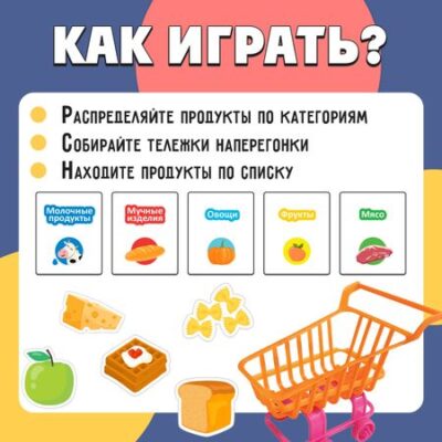 Развивающий набор «Разбери по тележкам». Развивающий набор «Разбери по тележкам» поможет малышам от 3 лет изучить разнообразие продуктов в игровой форме. Благодаря занятиям с набором ребенок узнает основные продукты питания, их состав и происхождение, расширит словарный запас, а также потренирует логику и память. <b> Как использовать набор</b> <ul> <li> Разложите карточки перед ребенком и попросите его назвать их одним общим словом. Правильный вариант — продукты.</li> <li> Спросите малыша, на какие еще категории можно разделить лежащие перед ним предметы? Дайте ребенку задание подумать, чем отличаются эти продукты, из чего их делают.</li> <li> Повесьте карточки с типами продуктов на тележки и попросите малыша рассортировать карточки с едой по категориям продуктов. Затем поменяйте обозначения на тележках и продолжайте игру.</li> </ul> Больше упражнений вы найдете в памятке для родителей.
