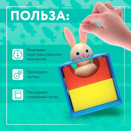 Развивающий набор «Кролик в домике», 3+. Развивающий набор «Кролик в домике» подойдет в качестве приятного и полезного презента малышу. Яркий красочный набор порадует его и надолго займет. Ребенку нужно будет расположить фигурки внутри домика так, как показано на картинках с заданиями. <b> Комплектация</b> <ul> <li> Домик и фигурка кролика.</li> <li> 3 блока.</li> <li> 60 заданий на карточках.</li> <li> Брошюра с инструкцией для выполнения заданий.</li> </ul> <b> Дополнительно</b> Набор рекомендован для занятий с детьми от 3 лет. <b> Развиваемся, играя</b> Игрушки радуют детей и делают их досуг веселым и увлекательным. А еще они помогают развиваться. Например набор «Кролик в домике» поможет малышу потренировать внимание, воображение, моторику, память и логическое мышление.