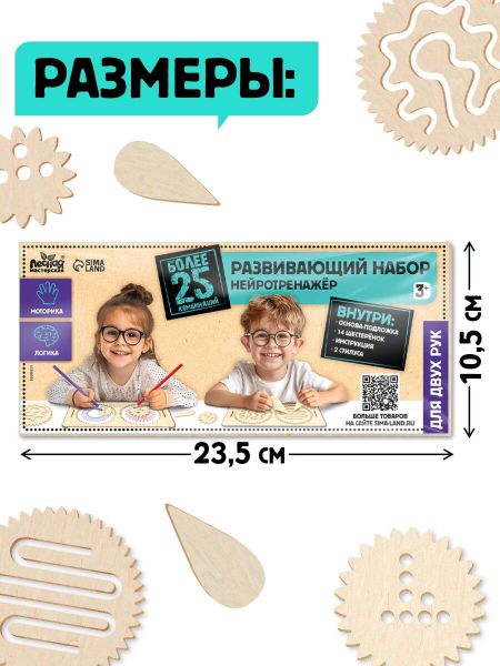 Развивающий набор «Нейротренажер. Шестеренки», 25 комбинаций. Развивающий набор «Нейротренажер. Шестеренки» предназначен для детей от 3 лет. Этот набор помогает развивать мелкую моторику, логическое мышление и координацию движений. Нейротренажер состоит из деревянных элементов, безопасных для ребенка, и предлагает 25 различных комбинаций. <b> Особенности набора</b> <ul> <li> Для детей от 3 лет, что делает его отличным выбором для раннего развития навыков.</li> <li> Изготовлен из натурального дерева, обеспечивая безопасность и долговечность.</li> <li> Лабиринты с 25 комбинациями позволяют разнообразить игровую деятельность и поддерживать интерес к игре.</li> </ul> Развивающий набор «Нейротренажер. Шестеренки» способствует развитию мелкой моторики, необходимой для подготовки к письму и рисованию, а также улучшению когнитивных способностей через логические задачи. Ребенок будет увлеченно играть, что также поможет развить усидчивость и концентрацию. Компактные размеры и небольшой вес делают набор удобным для хранения и транспортировки. Упаковка обеспечивает надежную защиту элементов от повреждений при доставке.