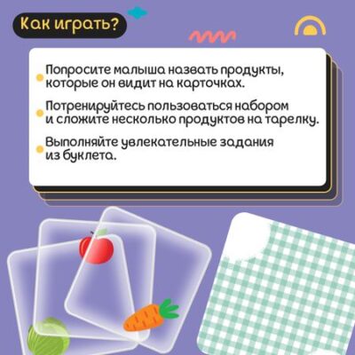 Развивающий набор «Собери обед». С развивающим набором «Собери обед» ребенок выучит названия продуктов, научится делить их на категории, а также потренирует логическое мышление и внимание. Внутри вы найдете подставку, карточки и 16 интересных заданий. <b> Как пользоваться набором</b> <ul> <li> Поставьте подставку перед ребенком.</li> <li> Выберите задание из буклета и положите подходящую к нему картонную карточку в подставку.</li> <li> Разложите пластиковые карточки, которые нужны для повторения картинки, и дайте малышу задание разложить их на основе в правильном порядке.</li> <li> Если картинка в буклете совпадает с собранной малышом, задание выполнено верно.</li> <li> Выкладывайте пластиковые карточки на основу, выполняйте задания из буклета или придумывайте свои!</li> </ul> Рекомендовано для занятий с детьми от 3 лет.
