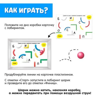 Развивающий набор «Дорожки из пластилина». Развивающий набор «Дорожки из пластилина» поможет ребенку в формате увлекательной игры потренировать ловкость, координацию и мелкую моторику. Стройте лабиринты из пластилина и ведите по ним мячик, выполняя задания. <b> Как играть</b> <ul> <li> Выберите карточку с лабиринтом. Продублируйте линии на карточке пластилином и поместите карточку на дно коробки.</li> <li> С отметки «Старт» запустите в лабиринт шарик и проведите его до отметки «Финиш».</li> <li> Шарик можно катить, наклоняя коробку, а можно передвигать с помощью воздушной струи.</li> <ul> <b> Полезно</b> <ul> <li> Поставьте коробку на стол и потренируйтесь проводить мячик через лабиринт с помощью дыхания.</li> <li> Дуйте на мяч и обходите препятствия.</li> <li> Такое упражнение отлично развивает речевое дыхание и легкие.</li> </ul> Набор рекомендован для занятий с детьми от 3 лет. </ul> </ul>