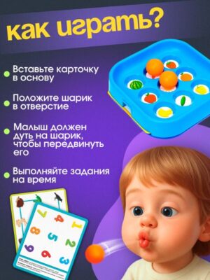 Развивающий набор «Дуй на мяч», игровая основа, шарики, набор карточек. Занимательная логопедическая игра «Дуй на мяч» — это отличная возможность потренировать дыхание и артикуляцию. А еще в процессе игры малыш закрепит навыки счета, знание букв и цветов. <b> Подготовка к игре</b> <ol> <li> Вставьте карточку из набора в основу и покажите ребенку, что получилось.</li> <li> Положите в одно из отверстий на основе мячик из набора.</li> <li> Попросите игрока дуть на мячик и передвигать его по основе шаг за шагом, чтобы дойди до конца карточки.</li> </ol> Такие занятия способствуют тренировке артикуляции и развитию речи у малыша. Усложняйте игру, например, можно попросить выполнять задания на время. Набор рекомендован детям старше 3 лет.