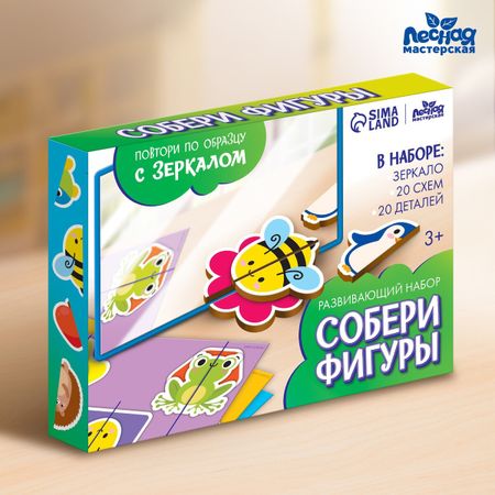 Развивающий набор «Собери фигуры». Развивающий набор «Собери фигуры» научит ребенка видеть мир не только в обычном свете, но и через отражение, через искривленный образ, в это время растет его воображение. Яркие картинки животных поднимут настроение и надолго привлекут внимание малыша, а также поспособствует развитию цветового и зрительного восприятия, внимательности и логического мышления. <b> Что входит в набор?</b> <li> Зеркало</li> <li> 20 схем</li> <li> 20 деталей</li> <b> Как играть?</b> <li> 1)Установи зеркало в устойчивом положении.</li> <li> 2)Выбери схему.</li> <li> 3)Найди нужную деталь, которая изображена на схеме.</li> <li> 4)Прислони деталь к зеркалу, в соответствие с выбранной схемой.</li>