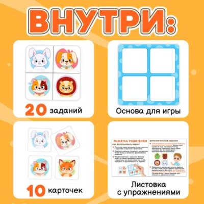 Развивающий набор «Сетка памяти», 10 карточек, 3+. Развивающий набор «Сетка памяти» — увлекательная игра для детей от 3 лет, которая тренирует внимание, логику и память в игровой форме. В комплекте 10 карточек и 20 заданий, а также памятка с дополнительными упражнениями. <b> Особенности</b> <ul> <li> Игровая основа для выполнения заданий.</li> <li> 10 карточек с животными и 20 карточек с заданиями.</li> <li> Памятка с советами для родителей.</li> </ul> <b> Как играть</b> Повторяйте положение животных по памяти, раскладывайте карточки и повторяйте, кто где лежал, используя пространственное мышление. <b> Польза для развития</b> Игра помогает ребенку: <ul> <li> развивать наблюдательность и концентрацию;</li> <li> улучшать зрительную память и внимательность;</li> <li> изучить понятие «право», «лево», «верх», «низ»;</li> <li> развить пространственное мышление.</li> </ul>