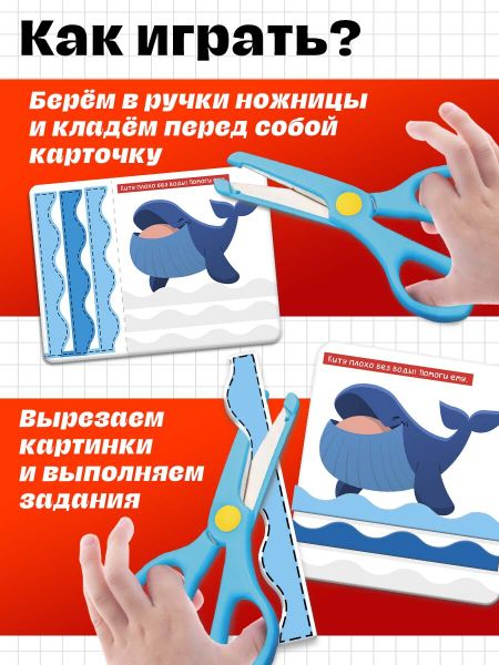 Развивающий набор «Умные ножницы», 40 карточек с заданиями, безопасные ножницы, 3+. Набор «Умные ножницы» — это увлекательный инструмент для развития ребенка, который включает безопасные ножницы и 40 карточек с заданиями. Идеально подходит для детей от 3 лет, помогает совершенствовать мелкую моторику, развивать воображение и укреплять самостоятельность через творческую деятельность. <b> Особенности</b> <ul> <li> В комплекте безопасные ножницы с закругленными концами, идеально подходящие для маленьких ручек.</li> <li> 40 разнообразных заданий, которые стимулируют внимание и воображение.</li> <li> Простые и интересные задачи, соответствующие возрасту от 3 лет.</li> </ul> <b> Как играть?</b> <li> Покажите ребенку как правильно держать ножницы.</li> <li> Выберите карточку и объясните малышу задание.</li> <li> Попросите ребенка вырезать картинку и выполнить задание.</li> <b> Польза для развития</b> Работа с набором тренирует мелкую моторику, развивает координацию движений и помогает формировать усидчивость. Карточки предлагают разнообразные задания, которые пробуждают воображение и помогают ребенку выражать себя через творчество.
