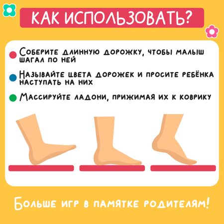 Развивающий набор «Массажная дорожка». Развивающий набор «Массажная дорожка» предназначен для малышей от 3 лет. Занятия с массажными дорожками помогут ребенку потренировать сенсорное восприятие, координацию движений и крупную моторику. <b> Развиваем баланс</b> <ul> <li> Соберите массажные коврики в одну длинную дорожку, чтобы малыш мог шагать по ней.</li> <li> Попросите ребенка пройти по ней от начала до конца, вытянув руки в стороны. Ступни нужно вплотную ставить друг за другом так, чтобы пятка касалась носка.</li> </ul> <b> Приставной шаг</b> <ul> <li> Дайте малышу задание встать на дорожку боком.</li> <li> Покажите, как ходить приставными шагами: сначала переставляем одну ногу, затем плотно приставляем к ней вторую.</li> <li> Задача малыша — стараться делать шаги не очень большими, чтобы вам хватило длины дорожки.</li> </ul> <b> Цветной твистер</b> <ul> <li> Скрепите коврики в один прямоугольник и предложите поиграть в необычную игру: вы называете предметы разных цветов, а ребенку нужно вставать на область такого же цвета. Например, «Лягушка» — встаем на зеленый коврик, «помидор» — переходим на красный коврик.</li> <li> Чтобы сделать задание интереснее и дополнительно потренировать чувство равновесия, можно попросить малыша стоять на одной ноге.</li> </ul> <b> Выполняйте упражнения из памятки, придумывайте свои задания и игры для развития малыша!</b>