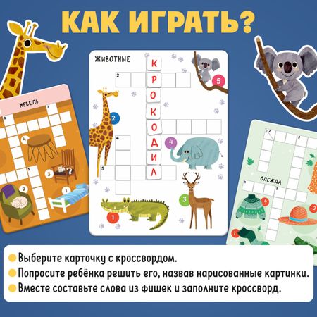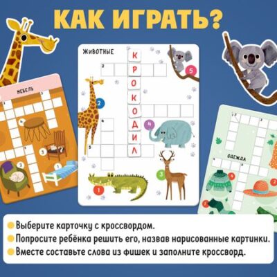 Развивающий набор «Логопедический кроссворд». Развивающий набор «Логопедический кроссворд» научит малышей от 3 лет произносить правильно звуки «Р» и «Л», а также потренировать чтение, составляя слова для логопедического кроссворда. Изображения предметов помогут вам обсудить разные темы от животных и фруктов до профессий и космоса. Внутри вы найдете набор фишек, 20 кроссвордов и брошюру с ответами. <b> Как играть</b> <ul> <li> Выберите карточку и подготовьте фишки с буквами.</li> <li> Попросите малыша назвать предметы на картинке и соотнести цифру рядом с картинкой и цифру в кроссворде.</li> <li> Заполните кроссворд вместе с ребенком, составляя слова из фишек.</li> </ul>