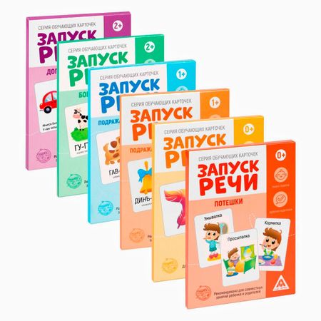 Развивающий набор 6 в 1 «Запуск речи» для комплексного развития, 2+. <b> 6 развивающих игр на запуск речи</b> Переживаете, что ребенок никак не заговорит? Хотите заниматься дома, но не знаете, с чего начать? Специально для запуска речи у самых маленьких деток мы совместно с педагогом и психологом Дарьей Даяновой разработали набор из 6 видов обучающих карточек, которые помогут отработать первые звуки и слова, а также развить мелкую моторику. <b> Как заниматься с карточками?</b> Выберите вид обучающих карточек, с которыми будете заниматься сегодня. Они разбиты по возрастам (от 0 до 2 лет), поэтому их удобно использовать. В каждой игре вы найдете подробную инструкцию, как заниматься с теми или иными карточками. Некоторые из них двухсторонние: на обороте написана пояснительная информация для родителей или воспитателей. <b> Как помочь ребенку развивать речевые навыки</b> <ul> <li> При общении с ребенком смотрите ему в глаза.</li> <li> Сохраняйте эмоциональный контакт. Показывайте малышу свою реакцию: улыбайтесь, ласково говорите с ним, покачивайте.</li> <li> Используйте яркие положительные интонации. Малыш копирует вашу речь — чем ярче будут интонации, тем раньше ребенок начнет лепетать и гулить интонационно.</li> <li> Следите за своей артикуляцией. На первом году жизни малыши смотрят на вашу мимику и повторяют движения губ. Так появляются первые звуки: гласные и губные согласные — п, б, м.</li> <li> Повторяйте простые слоги, слова, песни, стихи, потешки.</li> <li> Поощряйте диалог, даже когда ребенок непонятно лопочет, слушайте его. Потом говорите сами.</li> </ul> <b> Учим ребенка говорить в игровой форме!</b>
