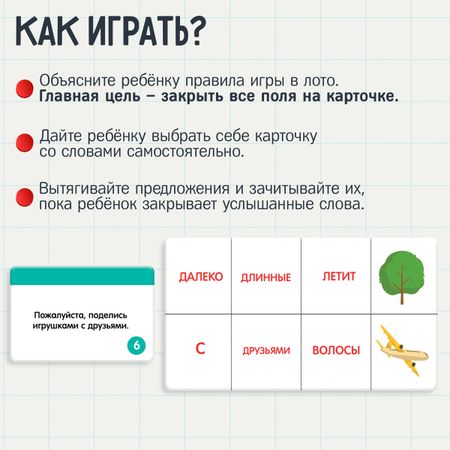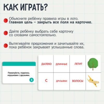 Развивающий набор «Слуховое лото». Развивающий набор «Слуховое лото» поможет малышам от 3 лет научиться читать и воспринимать информацию на слух, а также потренировать внимательность, логическое мышление и память. В эту игру можно играть вдвоем или в небольшой компании детей. Для этого выдайте каждому по карточке и по 8 жетонов. <b> Как играть</b> <ul> <li> Выберите карточку со словами. Карточки с предложениями перемешайте и сложите в колоду.</li> <li> Взрослый ведущий достает из колоды с предложениями карточку и зачитывает ее. Сначала четко проговаривает предложение, затем называет отдельные слова.</li> <li> Ребенку нужно внимательно выслушать и закрыть фишками отсеки, в которых есть названные слова. Цель игры — закрыть все слова на карточке.</li> </ul>