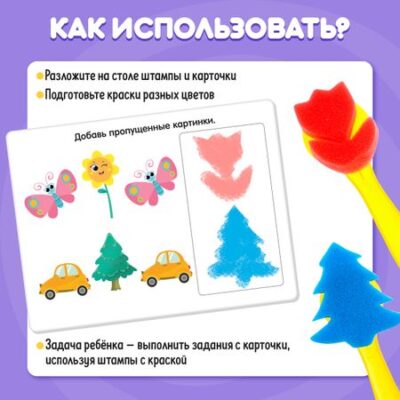 Развивающий набор «Яркие штампы». С помощью развивающего набора «Яркие штампы» вы потренируете логику и внимательность малыша, а также разовьете его творческие способности, используя в обучении нестандартные материалы. <b> Как использовать набор</b> <ul> <li> Для выполнения заданий вам потребуются краски.</li> <li> Разложите на столе штампы и карточки, подготовьте краски разных цветов.</li> <li> Задача ребенка — выполнить задания с карточек, используя штампы с красками. Например, добавить пропущенные картинки, нарисовать людей, которые слушают музыку, добавить на карточку деревья, чтобы лесным зверушкам было хорошо, и т. д.</li> <li> Рисуйте с помощью печатей и пальчиков и придумывайте свои игры, чтобы сделать занятия еще интереснее.</li> </ul> <b> Преимущества набора</b> <ul> <li> Штампы с большой пластиковой ручкой удобно держать в руках.</li> <li> Поролон держит форму, за счет этого получаются ровные картинки.</li> <li> Штампы можно мыть и использовать многократно.</li> <li> Карточки из плотного материала, не намокают.</li> </ul> Набор рекомендован для занятий с детьми от 3 лет.