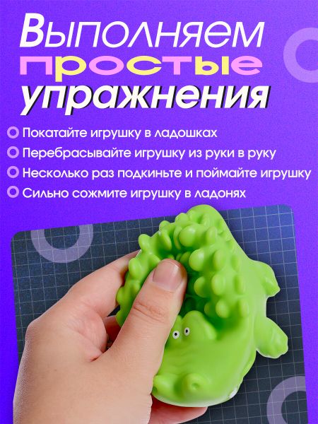 Развивающий набор «Колючие зверушки», 3+. Развивающий набор «Колючие зверушки» — это увлекательные игрушки для малышей от 3 лет, помогающие тренировать моторику и снимать напряжение. В комплекте два ярких зверька, которые приятно держать в руках, мять и перекатывать. <b> Преимущества</b> <ul> <li> Яркие цвета и забавная форма вызывают интерес у детей.</li> <li> Игрушки легко помещаются в ладони, их удобно брать с собой.</li> <li> Безопасный пластик без запаха, подходит для частого использования.</li> <li> Две игрушки в комплекте.</li> </ul> <b> Как играть</b> <ul> <li> Покатайте игрушку в ладошках.</li> <li> Перебрасывайте игрушку из руки в руку.</li> <li> Несколько раз подкиньте и поймайте игрушку.</li> <li> Сильно сожмите игрушку с ладонях.</li> </ul> <b> Польза и развитие</b> <ul> <li> Развитие мелкой и крупной моторики через тактильные ощущения.</li> <li> Укрепление межполушарных связей — ребенок учится координировать движения обеих рук.</li> <li> Антистресс-эффект — игрушки можно мять, катать и сжимать, расслабляя пальцы и кисти.</li> <li> Пальчиковая гимнастика, полезная для подготовки к письму.</li> </ul>