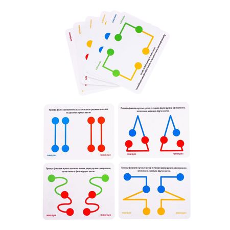 Развивающий набор «Ловкие фишки», межполушарное развитие, 10 карточек, 3+. Развивающий набор «Ловкие фишки» поможет потренировать оба полушария мозга. Ребенку предстоит выполнять задания одновременно двумя руками, а еще считать и сортировать фигурки. <b> Как пользоваться набором</b> <ol> <li> Разложите фишки и карточки перед ребенком.</li> <li> Посмотрите на задания. Попросите малыша поставить пальчик на фишку, подвести его к началу линии и вести по ней.</li> <li> Пусть теперь кроха выполнит задание одновременно двумя руками.</li> </ol> В инструкции представлено несколько вариантов развивающих игр. Например, упражнение «Ловкие пальчики». <b> Как выполнять упражнение</b> <ul> <li> Пусть ребенок разложит все фишки в один ряд, последовательность цветов значения не имеет.</li> <li> Давайте малышу свои задания: пусть он поставит пальчик правой руки на красную фишку, а пальчик левой — на зеленую.</li> <li> Усложняйте задания: теперь пусть он запоминает названия каждого пальчика. Например, поставьте указательный пальчик правой руки на оранжевую фишку, а мизинец левой — на синюю.</li> </ul> Такая игра тренирует звуковое восприятие, память, логику, внимание и моторику. Познакомьте малыша с другими упражнениями, фантазируйте и придумывайте свои. Набор рекомендован детям старше 3 лет.