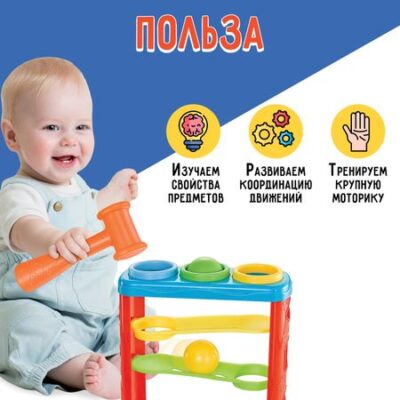 Развивающий набор «Горка-стучалка». Набор «Горка-стучалка» — это увлекательная игрушка для малышей от 1 года. Яркая горка с шариками и молоточком станет отличным подарком, который поможет ребенку развивать координацию движений и логическое мышление. Простая, но захватывающая игра надолго увлечет малыша. <b> Особенности</b> <ul> <li> В комплекте горка, 3 шарика и молоточек.</li> <li> Игрушка изготовлена из прочного пластика, безопасного для детей.</li> <li> Подходит для малышей от 1 года.</li> </ul> <b> Как играть</b> <ul> <li> Положите шарик в отверстие сверху.</li> <li> Попросите малыша стукнуть по шарику молоточком.</li> <li> Наблюдайте, как шарик скатывается с горки.</li> </ul> <b> Развиваемся играя</b> Игра с горкой и молоточком помогает малышу развивать мелкую моторику и учит его координировать движения. Ребенок с удовольствием будет стучать молоточком, отправляя шарики вниз по горке, наблюдая за их движением. Это не только весело, но и полезно для его развития.