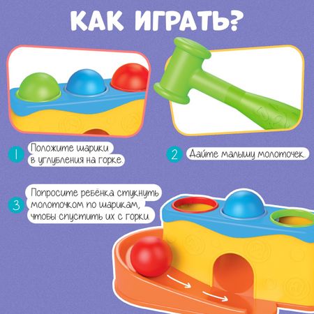 Развивающий набор «Веселая горка». Набор «Веселая горка» — это увлекательная игрушка для малышей от 1 года. Яркая горка с шариками и молоточком станет отличным подарком, который поможет ребенку развивать координацию движений и логическое мышление. Простая, но захватывающая игра надолго увлечет малыша. <b> Особенности</b> <ul> <li> В комплекте горка, 3 шарика и молоточек.</li> <li> Игрушка изготовлена из прочного пластика, безопасного для детей.</li> <li> Подходит для малышей от 1 года.</li> </ul> <b> Как играть</b> <ul> <li> Положите шарики в углубления на горке.</li> <li> Попросите малыша стукнуть по шарику молоточком.</li> <li> Наблюдайте, как шарик скатывается с горки.</li> </ul> <b> Развиваемся играя</b> Игра с горкой и молоточком помогает малышу развивать мелкую моторику и учит его координировать движения. Ребенок с удовольствием будет стучать молоточком, отправляя шарики вниз по горке, наблюдая за их движением. Это не только весело, но и полезно для его развития.