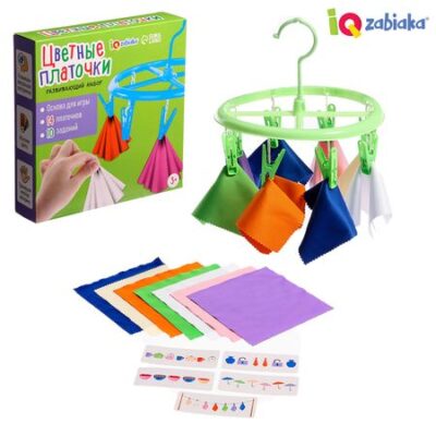 Развивающий набор «Цветные платочки» поможет малышам от 3 лет повторить названия цветов, научиться сравнивать предметы и потренировать ловкость пальчиков и ручек.Как игратьПовторяем цвета: повесьте игровую основу перед ребёнком. Прикрепите к прищепкам платочки и попросите подобрать к ним пары по цвету.Развиваем логику: начните чередовать платочки на основе по количеству. Например, 1 платочек, пустая прищепка, 1 платочек. Попросите ребёнка закончить ряд, не нарушая созданной вами последовательности.Тренируем счёт: положите карточку перед ребёнком. Попросите малыша посчитать предметы на карточке и развесить на прищепках столько же платочков.Выполняйте задания по образцу: положите перед ребёнком карточку и попросите развесить платочки на основе в том же порядке. Первую прищепку покажите малышу сами, а дальше помогайте наводящими подсказками.Польза занятий с развивающим набором «Цветные платочки»Ребёнок в лёгкой игровой форме потренирует логическое мышление и память, научится выполнять задания с карточек и расширит свой кругозор.