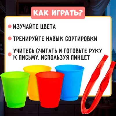 Развивающий набор для сортировки «Пинцет и стаканчики», сортер, по методике Монтессори. Этот волшебный инструмент научит вашего ребенка навыку захвата! Подходит для занятий по методике Монтессори: сортировки, перекладывания и захвата предметов. Эргономичный пинцет способствует развитию мелкой моторики, координации, мышления, ловкости и внимания. Занятия с ним подготавливают руку малыша к рисованию, письму и развивают усидчивость. Используйте инструмент для обучающий игры с такими материалами, как шарики-растушки, вода, песок. Попросите малыша с помощью пинцета опустить предмет необходимого количества или расцветки в стаканчик. Обучайте ребенка счету и цветам. Пинцет для занятий по методике Монтессори рекомендован детям старше 3 лет. <b> Познавайте мир вместе с нами!</b>