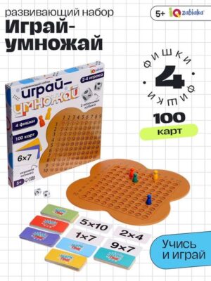 Настольная игра «Играй-умножай» — увлекательный способ запомнить таблицу умножения в компании друзей или семьи. Подходит детям от 5 лет и превращает обучение в игру.Особенности игры100 карточек с примерами.Для 2–4 игроков — можно играть с друзьями, родителями или даже устроить семейный турнир по математике.Ребёнок не только запомнит таблицу умножения, но и научится быстро считать в уме.Как играть:Вытягивайте карточки с примерами и просите ребёнка найти правильный ответ на пример на доске и поставить туда фишку. Объясните малышу, что нужно находить числа с карточки на доске и смотреть, где они соединяются.Играйте с ребёнком на скорость, переворачивайте карточки по одной и находите ответы на доске.Кто первый правильно поставит фишку, тот забирает себе карточку. Побеждает тот, у кого в конце игры будет больше карточек с примерами.Развиваемся играяНастольная игра «Играй-умножай» делает математику понятной и доступной. Подходит для дошкольников и младших школьников, помогает подготовиться к школе и улучшить навыки счёта. Отличный вариант для подарка!