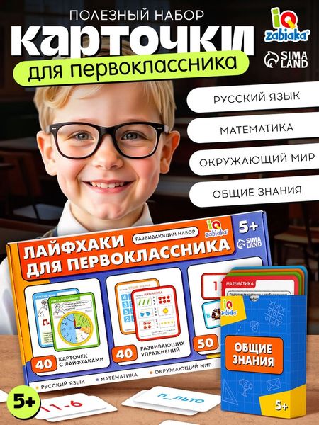 Набор «Лайфхаки для первоклассника» — это отличный помощник для подготовки ребёнка к школе. С помощью ярких карточек с заданиями и упражнениями малыш легко освоит базовые навыки, которые пригодятся в первом классе. Набор станет полезным подарком для детей от 5 лет, помогая развивать память, логику и внимание в игровой форме.Особенности40 карточек с лайфхаками — простые и понятные советы для освоения школьных навыков.40 развивающих упражнений — задания для тренировки памяти, счёта и грамотности.50 карточек с заданиями — увлекательные игры для изучения русского языка, математики и окружающего мира.Подходит для детей от 5 лет — идеальный возраст для подготовки к школе.Как использовать набор?Карточки с лайфхаками помогут ребёнку быстро запомнить важные правила, а упражнения и задания закрепят знания.Играем с пользойС набором «Лайфхаки для первоклассника» ребёнок не только подготовится к школе, но и разовьёт важные навыки: память, логическое мышление, внимание и усидчивость. Игровой подход к обучению делает процесс увлекательным, а разнообразие заданий не даст заскучать.
