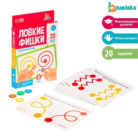 Развивающий набор «Ловкие фишки» поможет потренировать оба полушария мозга. Ребёнку предстоит выполнять задания одновременно двумя руками, а ещё считать и сортировать фигурки.Как пользоваться наборомРазложите фишки и карточки перед ребёнком.Посмотрите на задания. Попросите малыша поставить пальчик на фишку, подвести его к началу линии и вести по ней.Пусть теперь кроха выполнит задание одновременно двумя руками.В инструкции представлено несколько вариантов развивающих игр. Например, упражнение «Ловкие пальчики».Как выполнять упражнениеПусть ребёнок разложит все фишки в один ряд, последовательность цветов значения не имеет.Давайте малышу свои задания: пусть он поставит пальчик правой руки на красную фишку, а пальчик левой — на зелёную.Усложняйте задания: теперь пусть он запоминает названия каждого пальчика. Например, поставьте указательный пальчик правой руки на оранжевую фишку, а мизинец левой — на синюю.Такая игра тренирует звуковое восприятие, память, логику, внимание и моторику.Познакомьте малыша с другими упражнениями, фантазируйте и придумывайте свои.Набор рекомендован детям старше 3 лет.