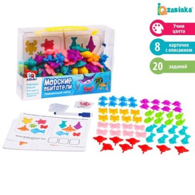 Развивающий набор «Морские обитатели» подходит для занятий по методике Монтессори. С набором малыш выучит основные цвета, потренирует мелкую моторику, логическое мышление, память, а также познакомится с разными животными.Что в набореВнутри вы найдёте 10 двусторонних карточек с 20 заданиями, 8 карточек с названиями и описанием животных, 88 пластиковых фигурок и маркер.Как пользоваться наборомРазложите перед малышом фигурки с карточками и приступайте к выполнению заданий.Например, поймайте всех скатов в пузырьки и обведите маркером, сосчитайте животных, сравните их количество и выложите фигурки по образцу.Когда ребёнок освоится, фигурки можно использовать как счётный материал.