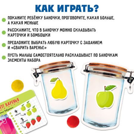 Развивающий набор-сортер «Что в баночке». Развивающий набор «Что в баночке?» создан для тренировки мелкой моторики и развития логического мышления. Ребенок познакомится с названиями фруктов и овощей, научится сортировать их по цвету, размеру и внешнему виду, а еще обучится счету. Внутри вы найдете 2 баночки, 25 цветных бомбошек, набор карточек с 10 заданиями и инструкцию. <b> Как играть</b> <ul> <li> Покажите ребенку баночки, обратите его внимание на то, что они разных размеров.</li> <li> Расскажите, что в баночку можно складывать карточки и бомбошки.</li> <li> Предложите выбрать любую карточку с заданием и «сварить варенье».</li> <li> Пусть малыш самостоятельно раскладывает по баночкам элементы набора.</li> <li> Выполняйте задания из памятки или придумывайте свои упражнения.</li> </ul> <b> Особенности набора</b> <ul> <li> Баночки выполнены из плотного пластика, их можно поставить на стол. Они имеют зип-застежку.</li> <li> Карточки и бомбошки легко вкладываются внутрь баночек и видны малышу.</li> <li> Карточки с заданиями прекрасно развивают фантазию и коммуникативные навыки.</li> </ul> Набор рекомендован для занятий с детьми от 3 лет.