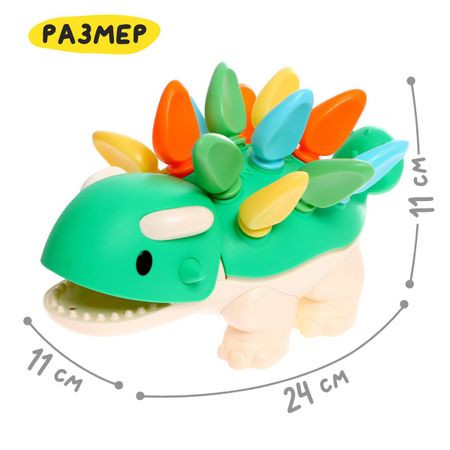 Развивающий набор-сортер «Умный дино». Развивающий набор «Умный дино» поможет малышу потренировать логическое мышление, моторику, внимание и память. Внутри вы найдете забавного динозаврика, 12 шипов и 2 кубика для занятий. <b> Как играть</b> <ul> <li> Перед занятием познакомьте малыша с динозавриком, покажите, как можно вставлять и доставать шипы из его спинки. Дайте ребенку возможность самостоятельно поиграть с игрушкой.</li> <li> Обратите внимание ребенка на цифры на спинке динозаврика: вместе посчитайте шипы, посмотрите, в каком порядке располагаются цифры.</li> <li> Назовите цвет шипа и номер отверстия. Например, «зеленый, 2». Пусть малыш найдет на спине динозаврика нужную цифру и вставит в отверстие над ней шип подходящего цвета.</li> <li> Покажите ребенку, как бросать кубики. Начните с цветного — пусть малыш бросает его, смотрит, какой цвет выпал, и вставляет или достает из спины динозавра деталь такого же цвета.</li> <li> Когда кроха освоится, добавьте в игру второй кубик с цифрами: объясните, что нужно поставить или достать столько шипов, сколько выпало на кубике.</li> <li> Вставьте несколько шипов в спину динозаврика. Попросите малыша внимательно рассмотреть и запомнить их расположение, а затем зажмуриться на несколько секунд.</li> <li> За это время добавьте или уберите несколько шипов. Когда ребенок откроет глаза, спросите, что изменилось.</li> <li> Фантазируйте и придумывайте свои увлекательные задания для ребенка.</li> </ul> Рекомендовано детям от 3 лет.