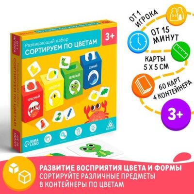 Развивающая игра для малышейЭто полезная игра, благодаря которой можно не только выучить основные цвета, но и натренировать мелкую моторику, координацию движений и глазомер. Мы подготовили 8 вариантов, чтобы интересно и с пользой провести время.Как играть?Поставьте все четыре контейнера перед ребёнком в один ряд. Подготовьте любой непрозрачный мешочек (в комплект не входит). Сложите в него все карточки. Потрясите мешочек, чтобы карточки перемешались.Ребёнок запускает руку в мешочек и достаёт первую попавшуюся карточку. Вместе произнесите, что на ней изображено и какого это цвета. Теперь задача ребёнка — поместить карточку в контейнер того же цвета, что и предмет или животное на карточке. На каждый контейнер приходится по 15 карточек этого цвета.Затем малыш вытягивает следующую карточку и опускает её в контейнер нужного цвета. Играйте до тех пор, пока все карточки не закончатся. А после можно заглянуть в контейнеры, посмотреть на карточки и достать их.В правилах есть и другие варианты игры, которые помогут малышу научиться мыслить логически, строить логические цепочки, искать лишнее, исправлять ошибки взрослого и многое другое!Внутри вы найдёте60 карточек.4 картонных контейнера.Правила игры.Играем и изучаем цвета!