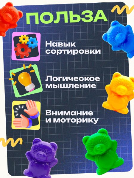 Развивающий набор-сортер «Мишки». Игра создана для тренировки мелкой моторики, обучению цветам и счету. Малыш будет раскладывать мишек пальчиками. Процесс можно усложнять, используя пинцет. Попросите кроху решить математические примеры на сложение и вычитание с помощью мишек. Разложите медвежат в соответствии с их цветами. Попросите кроху посчитать количество мишек каждого цвета и разложить их по соответствующим формочкам. Усложняйте задания: предложите малышу выполнить их на время. Для детей от 3 лет.