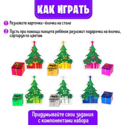 Развивающий сортер «Яркие подарки». Развивающий сортер «Яркие подарки» с пинцетом подходит для занятий по методике Монтессори. С набором малыш быстро запомнит цвета и научится считать. В комплект входит: 24 новогодних подарка и 4 карточки в форме елочки. <b> Как пользоваться набором?</b> <ol> <li> Расставьте перед малышом все подарочки и елочки.</li> <li> Помогите крохе научиться держать пинцет в ручках и цеплять им мелкие фигурки.</li> <li> Попросите ребенка с помощью пинцета переложить фигурки-подарочки в стаканчики, коробочки или любые другие емкости в соответствии с заданиями.</li> <li> Придумывайте свои задания, например, отсортировать предметы по количеству, цвету.</li> <li> Усложняйте задания: предложите малышу выполнить их на время.</li> </ol> Набор рекомендован детям старше 3 лет. Играть следует под присмотром родителей.