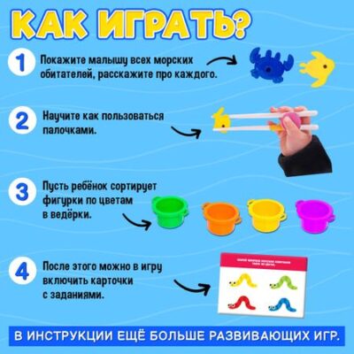 Развивающий сортер «Схвати рыбку». Развивающий сортер «Схвати рыбку» — эффективный способ обучения ребенка в игровом формате. Внутри вы найдете красочные ведерки, морских жителей и палочки. <b> Как пользоваться набором</b> <ul> <li> Перед началом занятий отсоедините всех морских обитателей от пластиковых креплений.</li> <li> Для игры понадобятся палочки. Покажите ребенку, как ими пользоваться.</li> <li> Разложите перед малышом по одному обитателю моря разных цветов и расставьте ведерки.</li> <li> Задача ребенка — с помощью палочек сортировать обитателей в ведерки подходящего цвета.</li> <li> Выполняйте задания с карточек. Например, поселите в аквариум 3 зеленых морских обитателя и 1 желтого, разложите морских жителей на столе так же, как на карточке, положите в квадратики синих морских обитателей, в кружки — красных, а в ромбики — желтых.</li> </ul> <b> Польза занятий с развивающим сортером «Схвати рыбку»</b> С такой игрой ребенок научится пользоваться палочками, повторит основные цвета, изучит основы счета, а также потренирует мелкую моторику рук, логическое мышление и внимание. Игра рекомендована детям старше 3 лет.