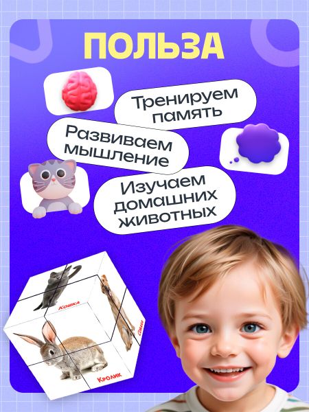 Развивающий трансформер «Умникуб: Домашние животные», 3+. «Умникуб: Домашние животные» — развивающий трансформер для детей от 3 лет. С увлекательной игрушкой ребенок запомнит названия домашних животных, разовьет память и пополнит словарный запас. <b> Как играть</b> Крутите кубик, составляйте картинки и называйте изображенных животных. <b> Картинки животных</b> <ul> <li> Кошка.</li> <li> Собака.</li> <li> Корова.</li> <li> Овца.</li> <li> Курица.</li> <li> Свинья.</li> <li> Лошадь.</li> <li> Коза.</li> <li> Осел.</li> <li> Кролик.</li> <li> Гусь.</li> <li> Индюк.</li> </ul> <b> Особенности</b> <ul> <li> Размер кубика: 8 × 8 см.</li> <li> Благодаря компактному формату игрушку можно использовать в любых условиях — дома, в поездках или на прогулке.</li> </ul> С Развивающим трансформером ребенок увлекательно проведет время, развивая логическое мышление, воображение и мелкую моторику.
