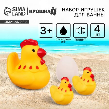 Резиновые игрушки для ванны Крошка Я «Курочка и детишки», с пищалкой, в наборе 4 шт.. Купаться веселее с любимыми игрушками! Набор резиновых игрушек поможет превратить купание в увлекательное приключение. Малыш изучает физические свойства воды, знакомится с окружающим миром через игру. Занятия в воде способствуют развитию логики, воображения и концентрации внимания. Забавляясь с фигурками, малыш будет тренировать мелкую моторику и тактильные ощущения. После игр в воде мы рекомендуем хорошо просушивать игрушку, чтобы она служила вам намного дольше. Изделия выполнены из мягкого безопасного материала — ПВХ (поливинилхлорида). Качество товара подтверждается сертификатом соответствия ЕАС. Предназначено для детей с 3 лет.