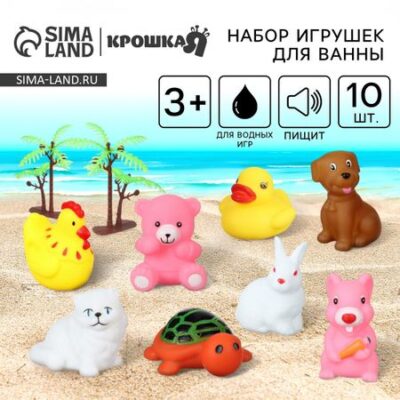Резиновые игрушки для ванны Крошка Я «На острове», с пищалкой, 10 шт.. Купаться веселее с любимыми игрушками! Набор игрушек поможет превратить купание в увлекательное приключение и привить малышу любовь к купанию! Мы разработали наборы специально для детей, которые только начинают познавать окружающий мир, веселые персонажи и предметы развивают кругозор крохи, его моторику и тактильное восприятие, позволяя сделать купание веселым и насыщенным! Развиваемся играя! После игр в воде мы рекомендуем хорошо просушивать игрушку, чтобы она служила вам намного дольше. Изделия выполнены из мягкого, пластичного безопасного материала — не содержащего вредных веществ. Качество товара подтверждается сертификатом соответствия ЕАС.