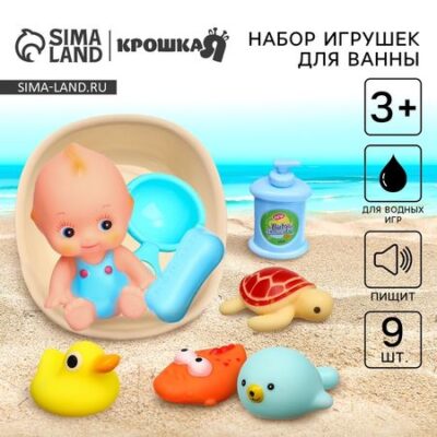 Резиновые игрушки для ванны Крошка Я, пупс для купания с ванночкой, ковшик, с пищалкой, в наборе 9 шт.
