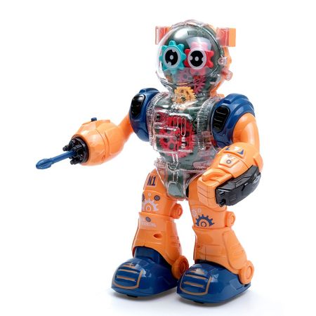 Робот «Шестеренка», свет, звук, оранжевый. Робот «Шестеренка» со световыми и звуковыми эффектами привлечет внимание трогательным дизайном и надолго займет малыша благодаря множеству полезных функций. Игрушка не только развлечет ребенка — с ним можно осваивать новые навыки! <b> Особенности робота</b> <ul> <li> Робот умеет ходить и стрелять (снаряды в комплекте) и говорить фразы на русском языке.</li> <li> Сквозь прозрачный корпус видно, как крутятся шестеренки.</li> <li> Яркий дизайн и светящиеся элементы привлекают внимание.</li> </ul> <b> Увлекательно и полезно</b> Играя с говорящим роботом, ребенок потренирует воображение, мелкую моторику, визуальное и слуховое мышление, а также начнет освоение причинно-следственных связей.