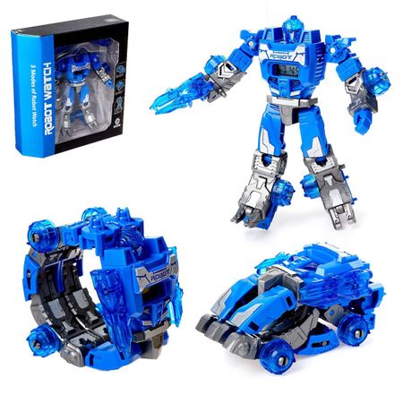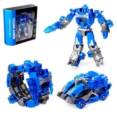 Робот «Часы», трансформируется в робота и машинку, цвет синий. Робот-трансформер «Часы» это не простая детская игрушка, а еще и настоящие электронные часы и робот два в одном! Яркие сочные цвета и увлекательный процесс трансформирования из часов в робота и обратно не дадут ребенку заскучать. Постоянная работа с деталями развивает мелкую моторику. <b> Особенности</b> <ul> <li> Электронный дисплей с защитной крышкой.</li> <li> Настройка времени: часы/минуты.</li> <li> Трансформация из робота в часы.</li> </ul>