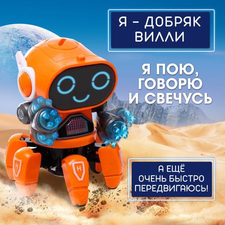 Робот музыкальный «Вилли», световые и звуковые эффекты, ходит, русская озвучка, цвет оранжевый. Добродушный пришелец «Вилли» прилетел на Землю с единственной целью — найти новых друзей. Это отличный подарок для маленького непоседы, ведь вместе с малышом Вилли будет петь песни, гулять по улице и даже танцевать! <b> Особенности</b> <ul> <li> Размер: 13 × 13 × 17,5 см.</li> <li> Звуковые эффекты: поет 2 песни, говорит 1 фразу.</li> <li> Световые эффекты: светится тело робота и руки.</li> <li> Робот «Вилли» ходит под музыку во всех направлениях и двигает руками.</li> <li> Работает от 3 батареек типоразмера AA (LR6) (в комплект не входят).</li> <li> Изготовлен из высококачественной нетоксичной пластмассы.</li> </ul> <b> Играем с пользой</b> Игры с дружелюбным «Вилли» способствуют развитию образного мышления, координации движений и воображения. С забавным пришельцем ребенок придумает множество увлекательных сюжетно-ролевых игр и невероятно весело проведет время.