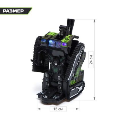 Робот радиоуправляемый «Роботанк», трансформируется, световые и звуковые эффекты. Из глубин космоса по заоблачным маршрутам на нашу планету прибыл невероятный гость — «Роботанк». Его главная особенность — умение трансформироваться из танка в робота. <b> Особенности игрушки</b> <ul> <li> Размер в виде робота: 15 × 13 × 24 см.</li> <li> Изготовлен из качественного, безопасного для детей пластика.</li> <li> Предназначен для детей старше 3 лет.</li> <li> Робот работает от 3 батареек типоразмера АА (нет в комплекте).</li> <li> Пульт работает от 2 батареек типоразмера АА (нет в комплекте).</li> <li> Радиус действия пульта — 20 м.</li> </ul> <b> Увлекательно и полезно</b> Игра с роботом способствует развитию мелкой моторики рук, помогает улучшить координацию и точность движений. Кроме того, процесс трансформации машинок в робота стимулирует творческие способности ребенка и воображение, позволяет создавать новые уникальные сценарии и истории для игры.