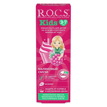 Детская зубная паста R.O.C.S. Kids «Малиновый Смузи» (без фтора) является современным высокоэффективным средством гигиены полости рта. Она разработана при участии стоматологов и учитывает возрастные особенности развития детей. Приятный вкус зубной пасты ROCS Kids «Малиновый Смузи», напоминающий душистую малину, низкоабразивная формула и уникальный состав позволяют обеспечить правильный и приятный уход за полостью рта ребенка, начиная с 3-х лет; защитить зубы от кариеса и приучить малыша к ежедневной гигиене ротовой полости без уговоров и нареканий. Паста зубная R.O.C.S. Kids «Малиновый Смузи» (без фтора) рекомендована детям в возрасте от 3 до 7 лет. Она эффективно защищает нежную эмаль молочных зубов от кариеса, не травмирует ее абразивом, обладает свойствами пробиотика и, в отличие от аналогичных средств гигиены, не содержит фтор. Благодаря уникальному составу (без фтора), данная зубная паста настоятельно рекомендуется стоматологами особенно в тех случаях, когда имеет место риск чрезмерного поступления фтора в детский организм: если ребенку назначены медикаментозные препараты (витаминно-минеральные комплексы или т.п.), содержащие фтор; если у ребенка очевидны признаки флюороза; когда в питьевой воде отмечается повышенное содержание фтора (более 1,2 мг/л). Избыточное потребление фтора способно привести к развитию гипофункции щитовидной железы, появлению флюороза и ряда других заболеваний. Такая паста позволяет минимизировать возможные риски, обеспечивая качественную комплексную и безопасную заботу о полости рта.