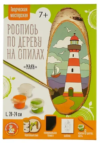 Роспись по дереву на спиле «Маяк» (косой спил) — набор, с помощью которого ребенок создаст красивую картину с изображением моря и маяка. Такую поделку можно подарить друзьям или близким, или украсить детскую комнату. Занятия росписью развивают мелкую моторику, художественный и эстетический вкус, тренируют внимательность и усидчивость.