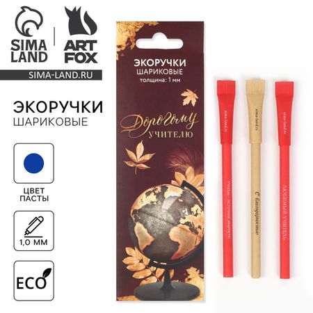 Ручка-эко, шариковая, синяя паста, 1.0 мм, 3 шт. «Дорогому учителю». Набор эко-ручек — отличный подарок. Яркий дизайн непременно привлечет внимание и будет выделяться среди других предметов, а удобная форма корпуса позволит пользоваться ею с комфортом. <ul> <li> Вид ручки: шариковая;</li> <li> Цвет стержня: синий;</li> <li> Стержень заменяемый: нет;</li> <li> Материал: бумага;</li> <li> Форма корпуса: круглая;</li> <li> Упаковка: пакет.</li> </ul>