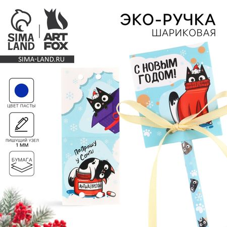 Ручка-эко шариковая, синяя паста, 1.0 мм, в открытке «Новый год: С новым Котом!». Эко-ручка торговой марки ArtFox отлично подойдет в качестве подарка. Яркий дизайн несомненно привлечет внимание и будет выделяться среди других предметов, а удобная форма корпуса позволит использовать ее с комфортом. <ul> <li> Стержень заменяемый: нет;</li> <li> Материал: бумага, чернила, пластик;</li> <li> Упаковка: пакет;</li> <li> Цвет стержня: синий;</li> <li> Вид ручки: шариковая.</li> </ul>