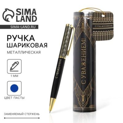 Ручка металлическая в тубусе «С Уважением!», синяя паста. Ручка отличное дополнение к подарку. Яркий дизайн несомненно привлечет внимание и будет выделяться среди других предметов, а удобная форма корпуса позволит использовать ее с комфортом. <ul> <li> Цвет стержня: синий;</li> <li> Стержень заменяемый: да;</li> <li> Материал: металл;</li> <li> Форма корпуса: круглая.</li> </ul>