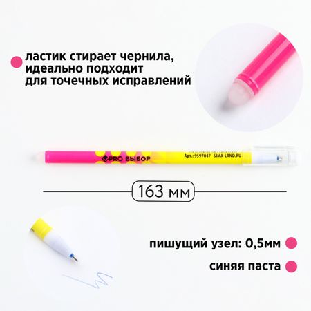 Ручка пиши-стирай, гелевая, 9 стержней, синяя паста, 0.5 мм «PROвыбор желтая». Ручка пиши-стирай торговой марки PRO Выбор — универсальный помощник в написании текстов. Идеально подходит для студентов, офисных работников и всех, кто ценит точность и аккуратность. Преимущества: • Удобный корпус; • Ластик для удаления чернил; • Идеально подойдет для точечных исправлений. <ul> <li> Длина, см: 16,3;</li> <li> Диаметр пишущего узла, мм: 0.5;</li> <li> Стержень заменяемый: да;</li> <li> Материал корпуса: пластик;</li> <li> Цвет стержня: синий;</li> <li> Тип: неавтоматическая ручка.</li> </ul>