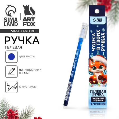 Ручка пиши-стирай, гелевая, синяя паста, 0.5 мм и стержни 9 шт. «Новый год: Чудеса в твоихх». Ручка торговой марки ArtFox отлично подойдет в качестве подарка. Яркий дизайн несомненно привлечет внимание и будет выделяться среди других предметов, а удобная форма корпуса позволит использовать ее с комфортом. <ul> <li> Цвет стержня: синий;</li> <li> Стержень заменяемый: да;</li> <li> Материал: пластик;</li> <li> Форма корпуса: круглая.</li> </ul>