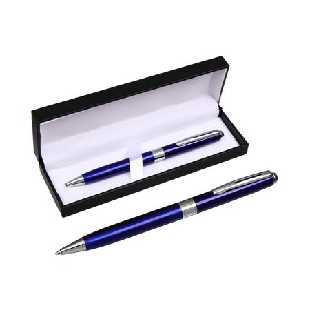 Ручка подарочная шариковая в кожзам футляре, поворотная New, корпус синий с серебром. Шариковая поворотная ручка — отличный инструмент для ежедневного использования. <ul> <li> Внутри корпуса — синие чернила.</li> <li> На ручке есть клип — можно закрепить ее на одежде или тетради.</li> <li> Благодаря диаметру пишущего узла 0,5 мм подходит для любого стиля письма.</li> <li> Гладкое скольжение пишущего узла, удобный корпус и доказанная надежность делает такие ручки одними из самых популярных письменных принадлежностей среди детей и взрослых.</li> </ul> Приобретайте шариковые ручки оптом в нашем магазине по выгодным условиям.
