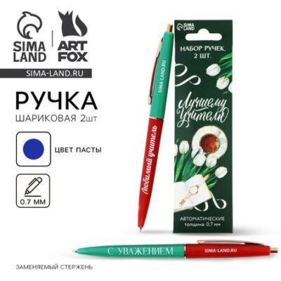 Ручка шариковая, автоматическая, 2 шт., пластик, синяя паста «Лучшему Учителю». Набор автоматических ручек — отличный подарок. Яркий дизайн непременно привлечет внимание и будет выделяться среди других предметов, а удобная форма корпуса позволит пользоваться ею с комфортом. <ul> <li> Вид ручки: шариковая;</li> <li> Цвет стержня: синий;</li> <li> Стержень заменяемый: да;</li> <li> Материал: пластик;</li> <li> Форма корпуса: круглая;</li> <li> Упаковка: пакет.</li> </ul>