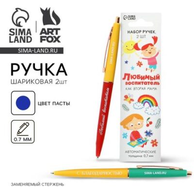Ручка шариковая, автоматическая 2 шт., пластик, синяя паста «Любимый воспитатель». Набор автоматических ручек — отличный подарок. Яркий дизайн непременно привлечет внимание и будет выделяться среди других предметов, а удобная форма корпуса позволит пользоваться ею с комфортом. <ul> <li> Вид ручки: шариковая;</li> <li> Цвет стержня: синий;</li> <li> Стержень заменяемый: да;</li> <li> Материал: пластик;</li> <li> Форма корпуса: круглая;</li> <li> Упаковка: пакет.</li> </ul>
