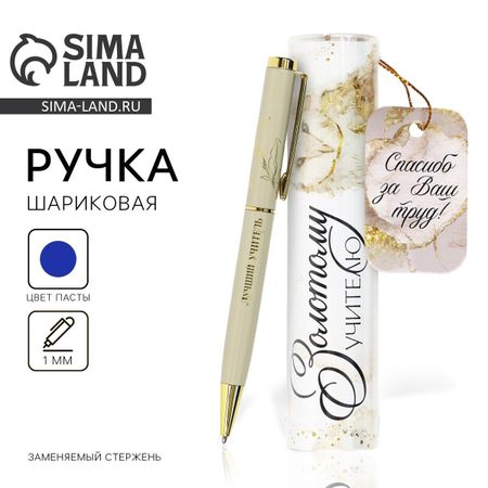 Ручка шариковая металлическая в тубусе, синяя паста, 1.0 мм «Золотому учителю». Ручка отлично подойдет в качестве подарка. Яркий дизайн несомненно привлечет внимание и будет выделяться среди других предметов, а удобная форма корпуса позволит использовать ее с комфортом. <ul> <li> Вид ручки: шариковая;</li> <li> Цвет стержня: синий;</li> <li> Стержень заменяемый: да;</li> <li> Материал: металл;</li> <li> Форма корпуса: круглая.</li> </ul> Упаковка: пакет.